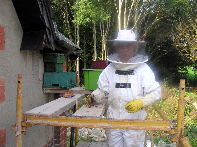 Here is a picture of me on the scaffold, you can see the small green nuc box sitting on a plastic crate at the same place as the old hive entrance on the right hand side of the picture.