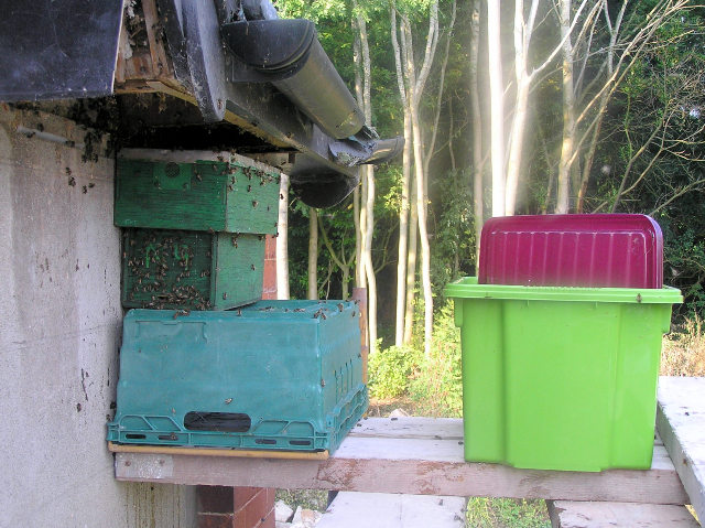 In the past when I have rescued wild/feral colonies I have used a method explained to me by my mentor in beekeeping Rog who always gives me the benefit of his wisdom and previous learning experiences. Earlier in the year I had talked to Rog about a wild colony in a chalet in North Devon that I wanted to re-locate as it was next to the kitchen and was starting to cause some concern for anyone staying there.