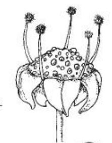 A diagram showing nectar granules on the ovary of the ivy flower. A photo of an ivy flower with nectar granules and then a bee collecting nectar from the ivy flower.