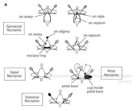 A nectary can be positioned wherever appropriate in terms of manipulating a visitors position. (Sepal, Petal, Staminal, Gynoecial) see the drawings below: