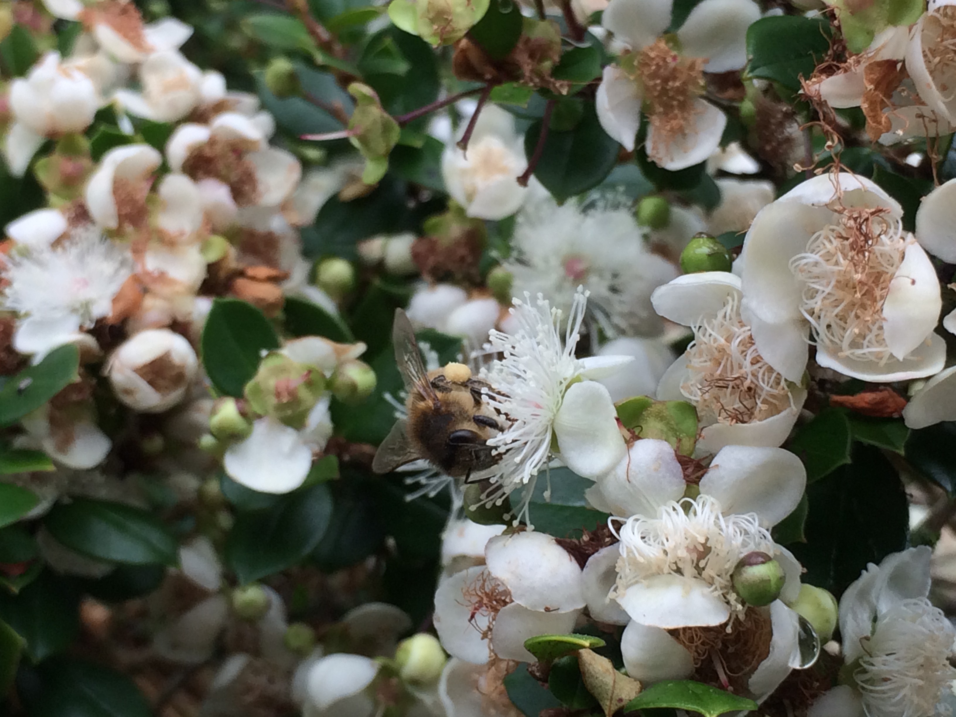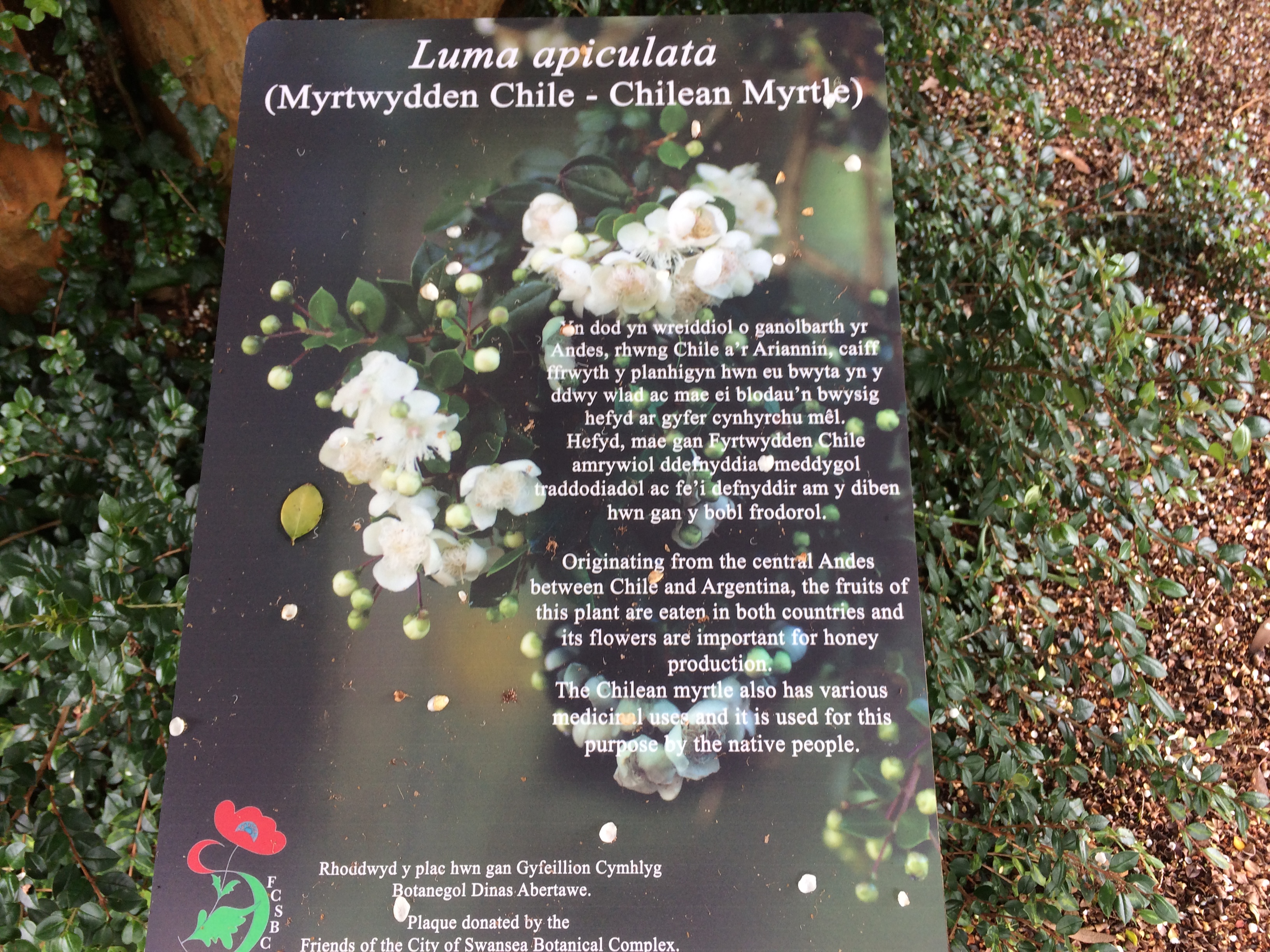 N.B. August 7th 2017 I was walking through the Botanical gardens at Singleton in Swansea SA2 8PP. I walked past a tree in full bloom, lovely little white flowers and then I heard what sounded like a swarm in the upper reaches of the tree. There were many honeybees foraging on the flowers of this tree. It is a Chilean Myrtle also known as Luma Apiculata.