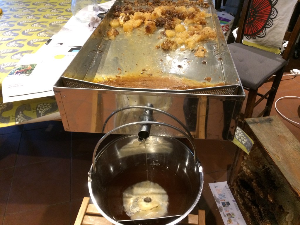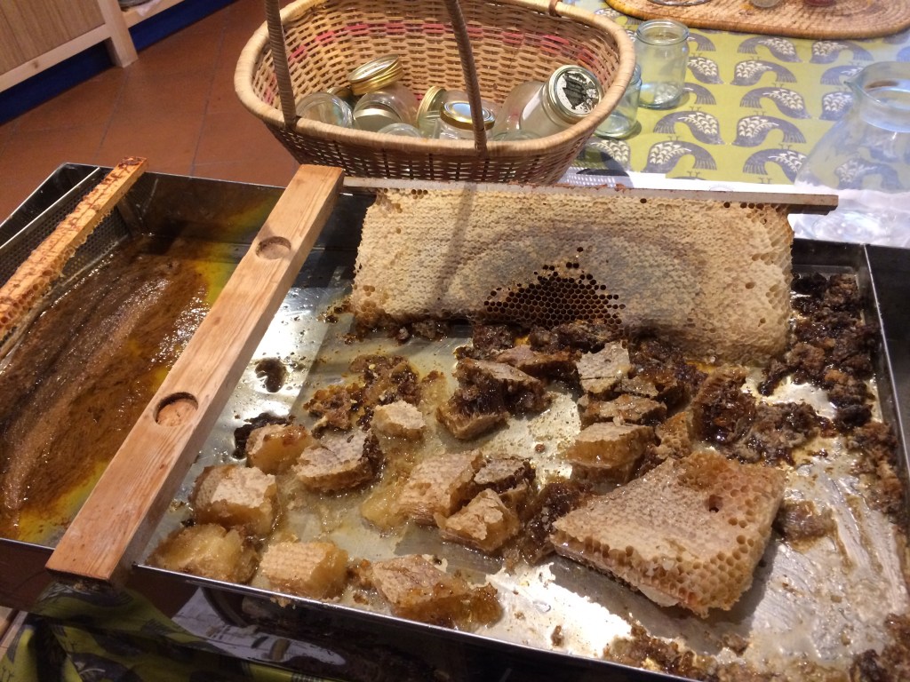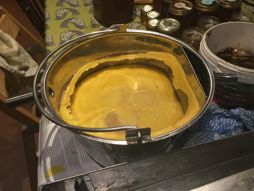 I had a super of honey in natural comb that I’d kept back for natural honeycomb, but found it had granulated. I used an uncapping tray borrowed from a friend, to slowly melt the comb. The tray splits the liquid honey and wax, photos below. Wax can be difficult to clean off, best to use cold water or scrape it off as hot water causes the wax to become very sticky.