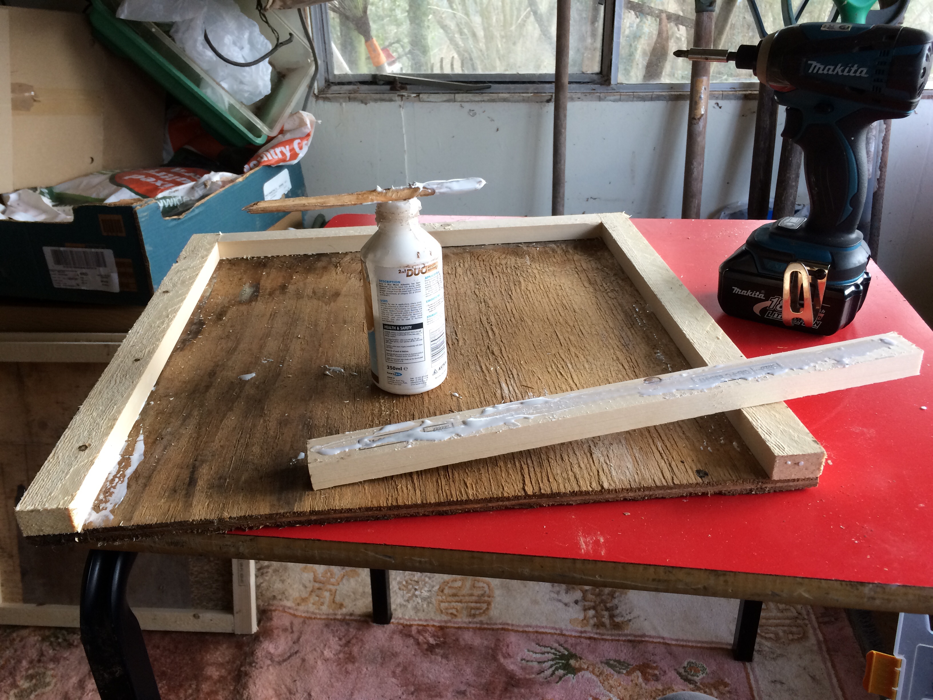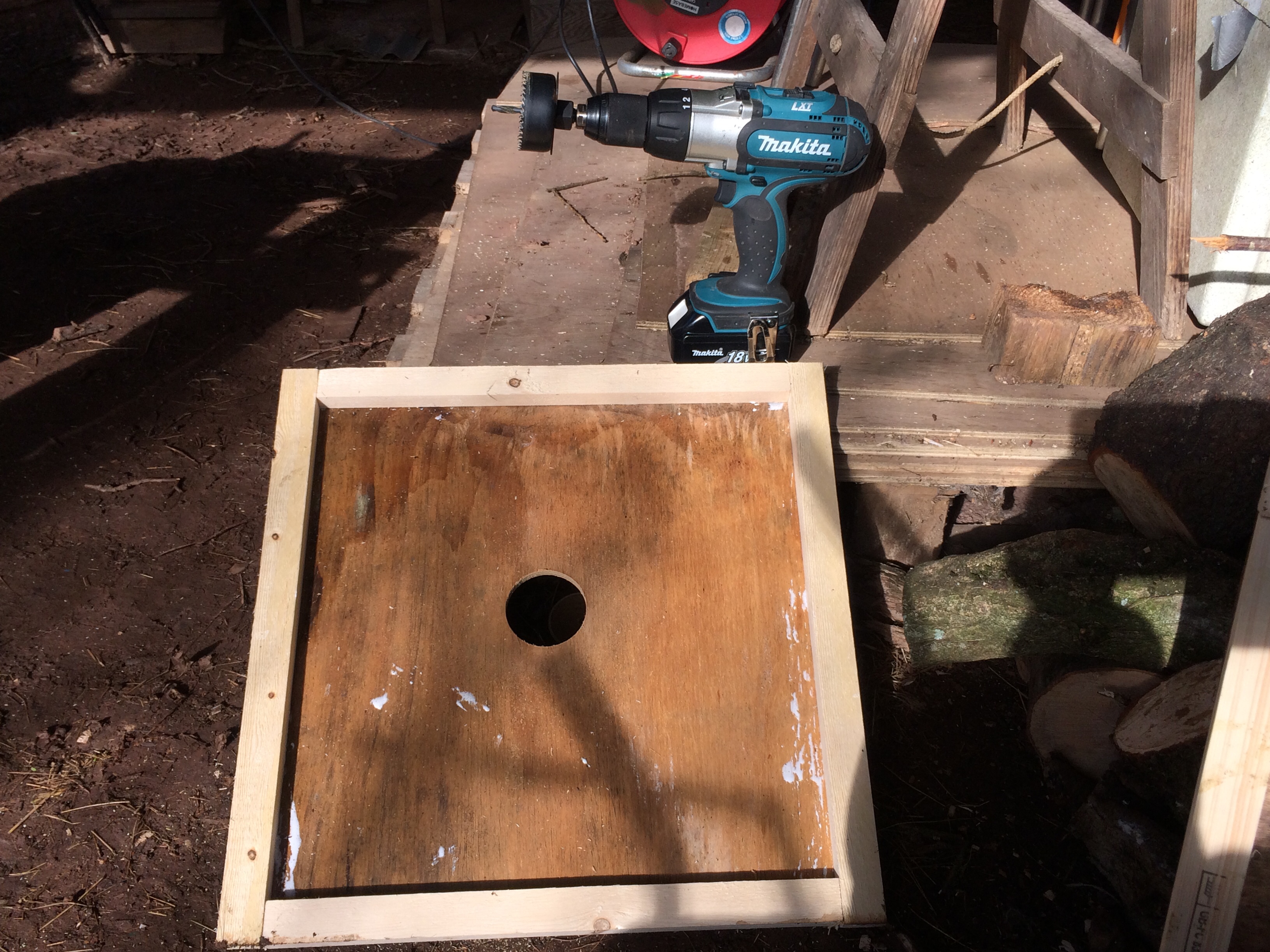 Apart from checking the colonies food levels by ‘hefting’ the hives I have been pottering about in what has now become my beeyard, doing general maintenance. I am waterproofing hive boxes; both brood and supers as well as floors and stands with Cuprinol or equivalent. I recently made up some cover boards (also called crownboard) from recycled wood, simple enough particularly if you have a power drill and chop saw to cut wood at right angles (I am ok with hand saws but prefer an electric chop saw to maintain those right angles).