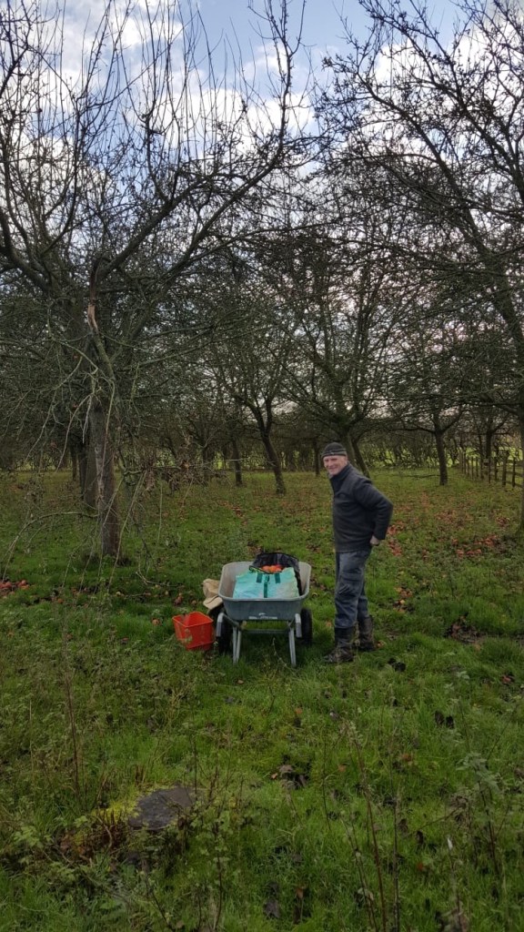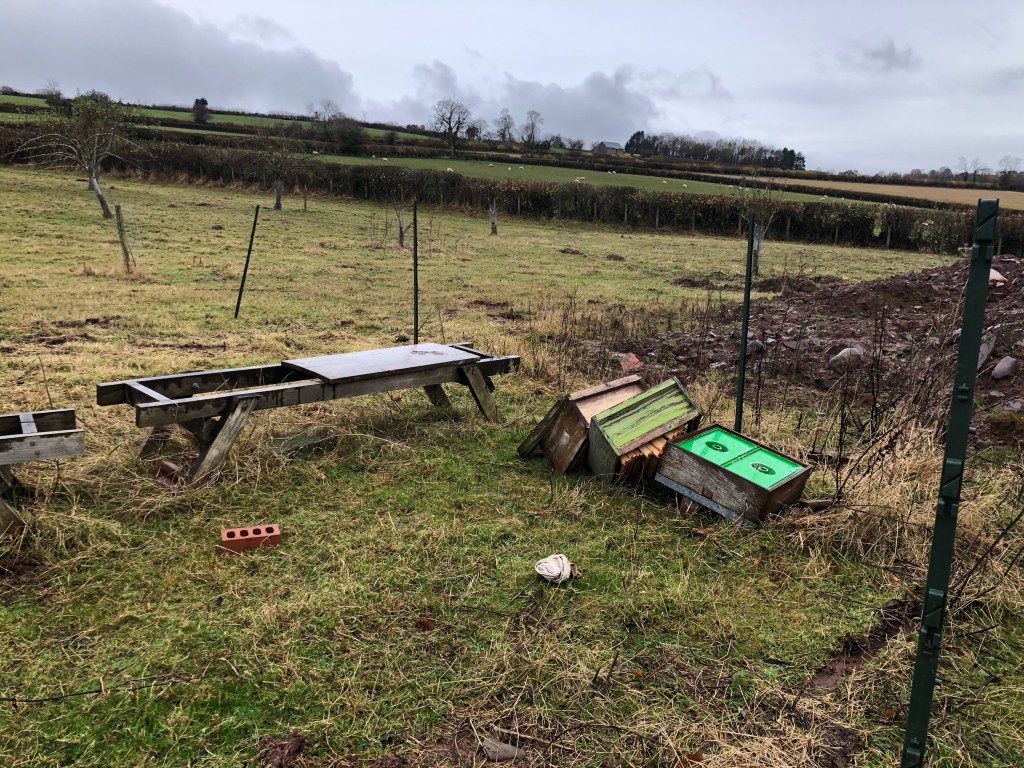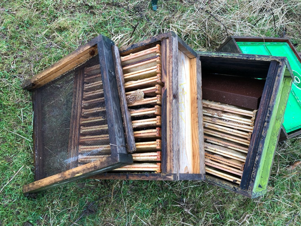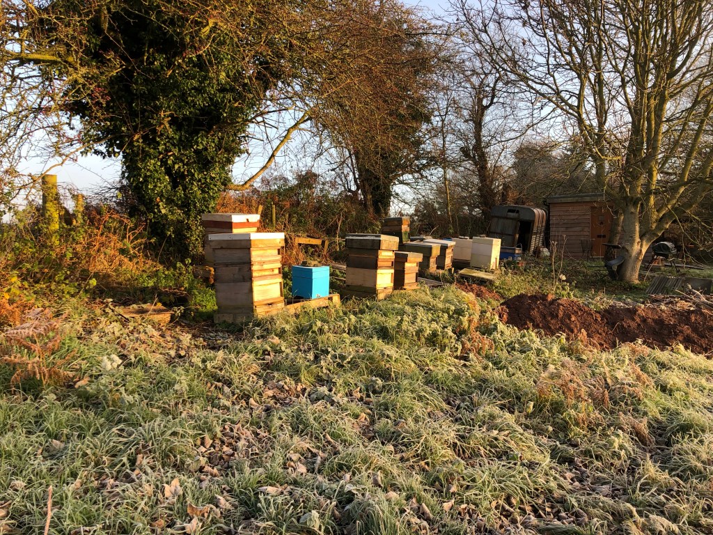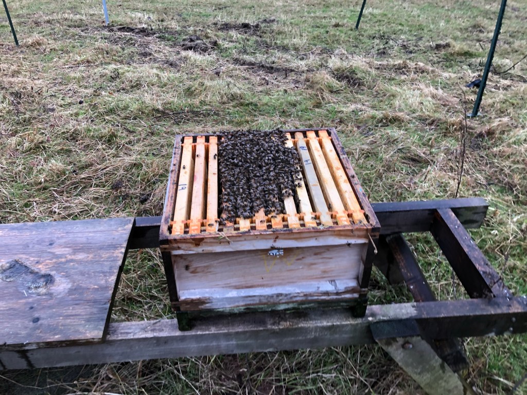 Earlier in the month I had a text from the owners of the orchard where the local beekeeping association has an apiary. One of the hives had fallen over. Not sure how, but it may have been caught by the wind, or nudged by a sheep. Anyway I couldn’t go that evening so went along early next morning to assess the situation. The colony was quite happy with the brood box on its side, luckily the weather wasn’t too cold or wet. I carefully reassembled the hive and as I did so the bees came up to the frame bars to have a look. The upper box was full of stores, plenty to get them through winter. I’ll return later to put a strap on it. the owners are also putting an electric fence around it to make sure the livestock don’t disturb them.