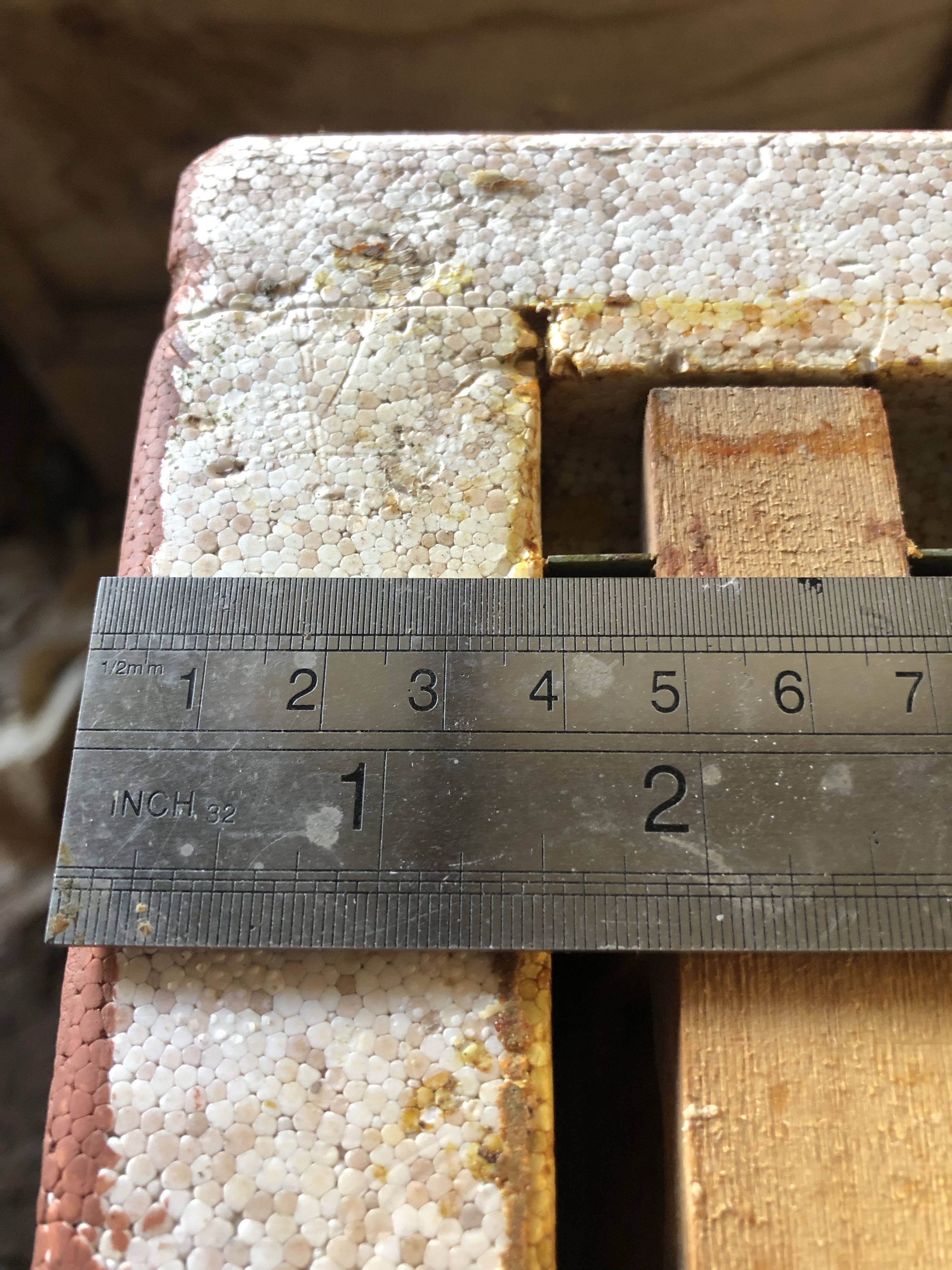 The polyhives (not poly nucs) have a wall thickness of 40mm compared to the wooden hives around 19mm. The thermal conductivity of expanded polystyrene is 0.034-0.038 W/m K, of oak its 0.197W/m K, and cedar is 0.099 W/m K
