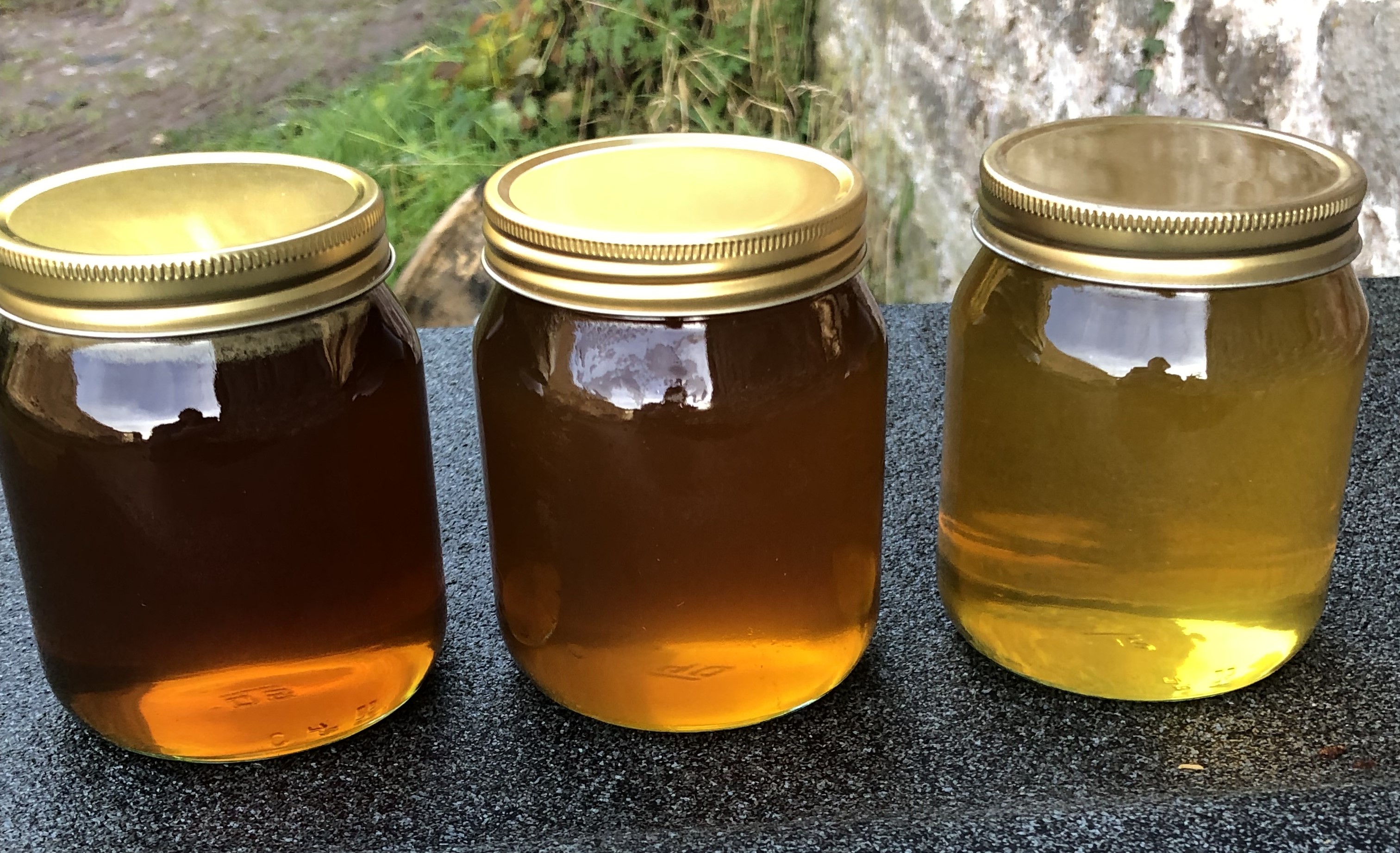 From right to left: light summer honey from 2022, Hawthorn honey spring 2023, Honeydew/Hawthorn mix early summer 2023
