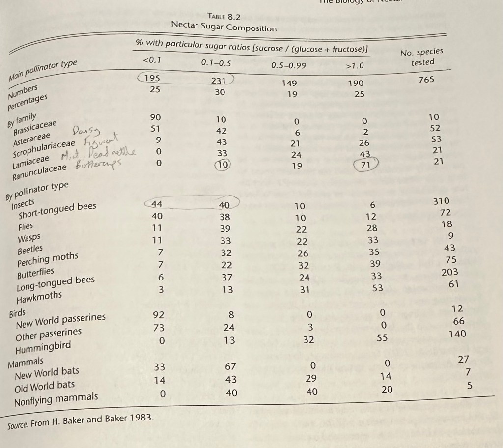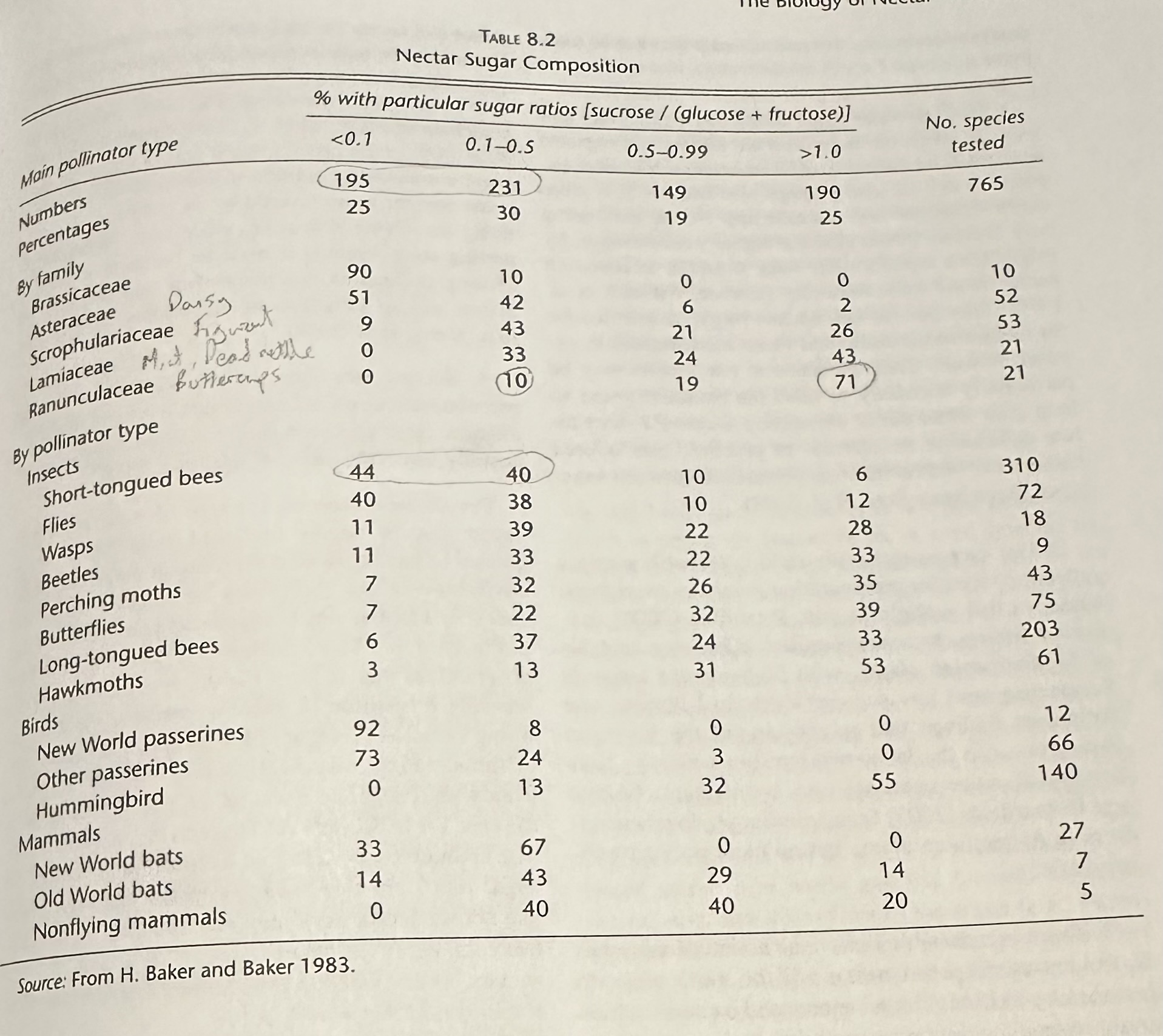 In general we see that short tongued bees much prefer hexose dominant nectar as offered by Brassicaceae and Asteraceae (Daisy) among others, tending to avoid those flowers that offer sucrose dominant nectar for example from Ranunculaceae (Buttercups) (P.Willmer 2004).