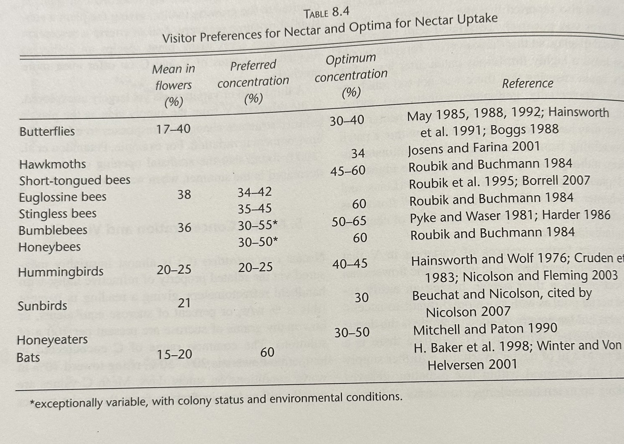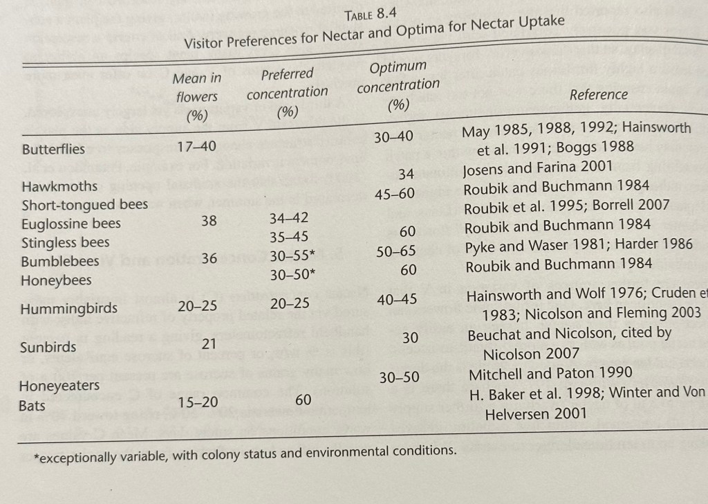 Honeybees can manage to suck up nectar with a high concentration of sugars, but longer tongued pollinators can’t manage the viscosity, and so what we see is that the tubular shaped flowers typically offer lower sugar concentrations to allow those pollinators to pollinate them, e.g. buddleia.