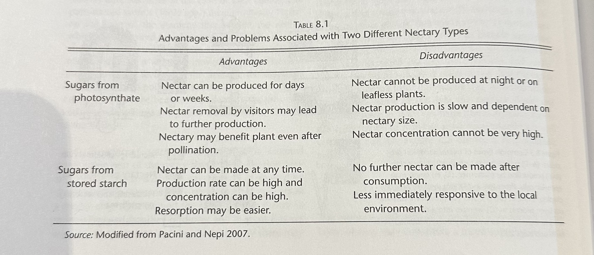 Defoliation experiments conducted with Impatiens glandulifera (Himalayan Balsam) demonstrated that only a fraction of the day’s nectar secretion depends on the day’s photosynthesis, while another fraction must be mobilized from stored photosynthates in storage organs (Burquez and Corbet, 1998).
